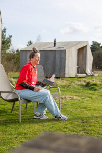 Ik logeerde in een Trek-In, een klein houten huisje midden op de camping. Binnen was het knus en eenvoudig, maar comfortabel genoeg om je helemaal thuis te voelen. De ramen boden een prachtig uitzicht op de natuur: kale bomen, open velden en het eerste groen dat voorzichtig zijn kopje liet zien. Het voelde alsof ik alleen op de wereld was, terwijl alles om me heen langzaam ontwaakte.
