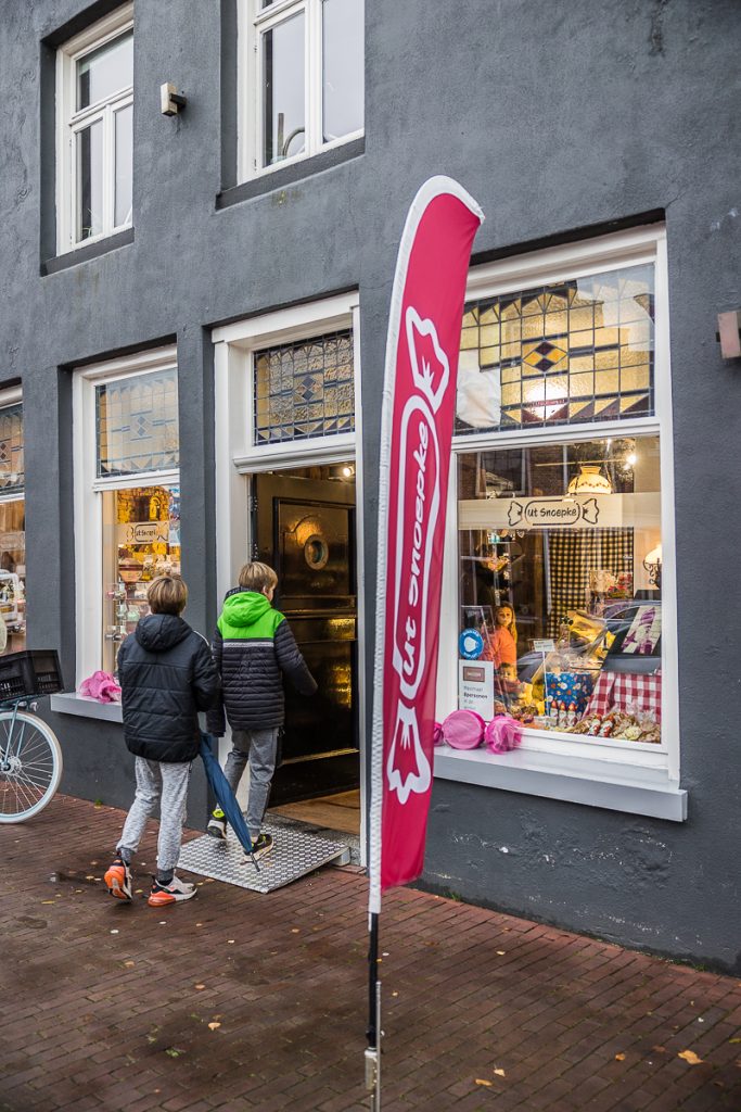 Nadat we ons geïnstalleerd hebben gaan we op pad, het wordt natuurlijk vroeg donker, maar ook dan is er veel sfeer in de stad. De straten zijn goed gevuld met winkelend publiek (Sneek is echt top om te shoppen!) en de restaurantjes vullen zich ook gezellig. Eerst bezoeken we een heus authentiek snoepwinkeltje in de stad waar de jongens wat lekkers uit mogen zoeken, altijd goed voor kids! Dit is in de buurt van de Waterpoort waar, na het vullen van de zakjes, heen lopen. Hier vinden we ook de fontein van Sneek; De fontein van Fortuna! Vlakbij de Waterpoort staat de fontein van kunstenaar Stephan Balkenhol die behoort tot het kunstproject ‘11fountains’. De man draagt de ‘hoorn des overvloeds’ en probeert zich staande te houden op een draaiende gouden bal. Het symboliseert de afwisselende periodes van voor- en tegenspoed van Sneek.
